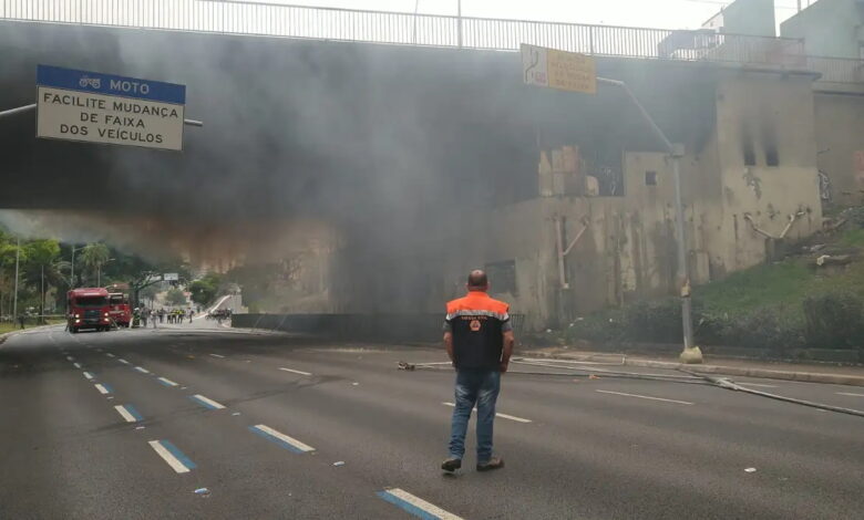 Fogo atinge viaduto Condessa de São Joaquim e interdita a Avenida 23 de Maio, causando grandes congestionamentos.