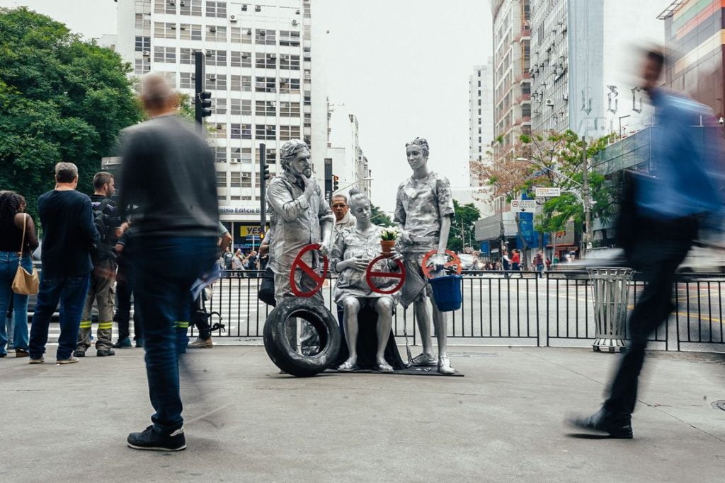 Uma intervenção artística com estátuas humanas em pontos de grande circulação na capital paulista neste fim de semana busca conscientizar a população sobre o combate à proliferação do mosquito Aedes aegypti. A ação faz parte Plano Municipal de Enfrentamento às Arboviroses, que promove ações educativas e de limpeza no período que antecede o verão para informar sobre os meios de proteção de doenças como dengue, febre pela Chikungunya e doença aguda pelo vírus Zika. Nesse período, o aumento das chuvas favorece o ciclo de reprodução do mosquito transmissor.