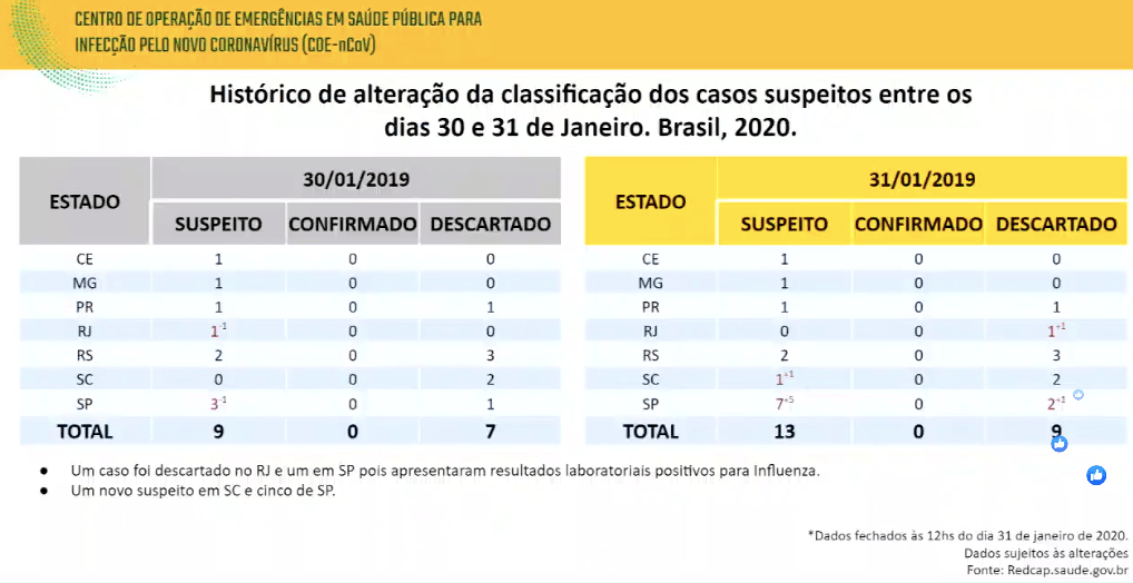 Até o momento, não há caso confirmado de coronavírus em São Paulo ou no Brasil. Segundo o Ministério da Saúde, até o 12h de hoje o Brasil registrava 13 casos suspeitos (o caso de Minas Gerais foi descartado mais tarde, reduzindo para 12 os casos suspeitos no país).