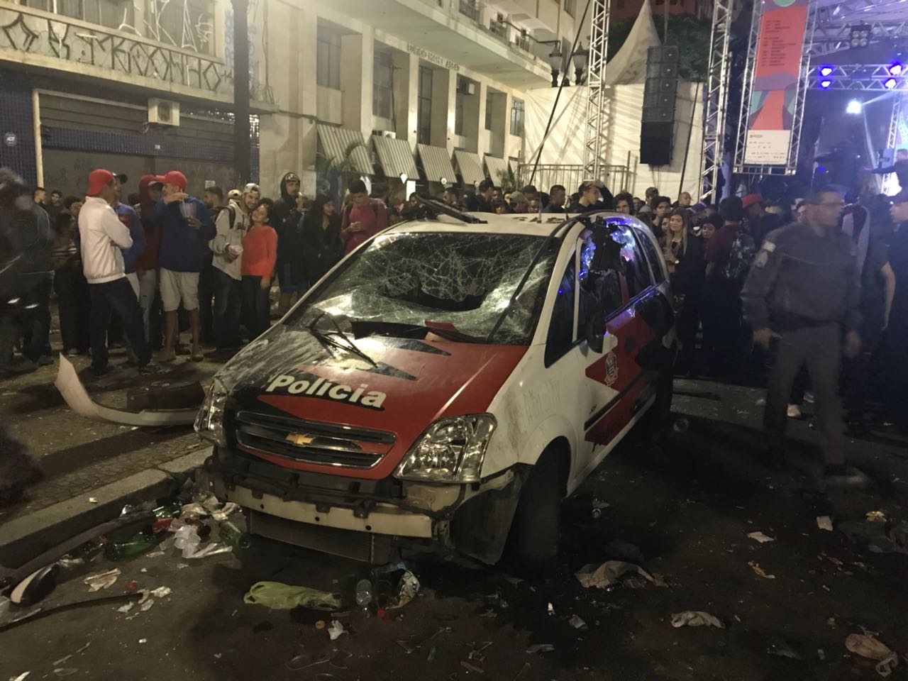 De acordo com informações da SSP, uma viatura do Departamento de Polícia de Proteção à Cidadania (DPPC) foi pichada na Avenida São João por volta das 3h. No vídeo acima é possível ver pessoas pulando em cima do carro da Polícia Civil. No áudio é possível ouvir alguém falando no microfone para não ter “vandalismo”.