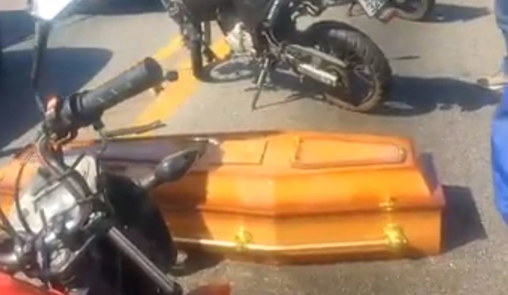 Motoqueiros que passavam pelo local estacionaram na pista enquanto esperavam o retorno do carro funerário. Quando a agente chegou, disse que não havia corpo dentro do caixão.