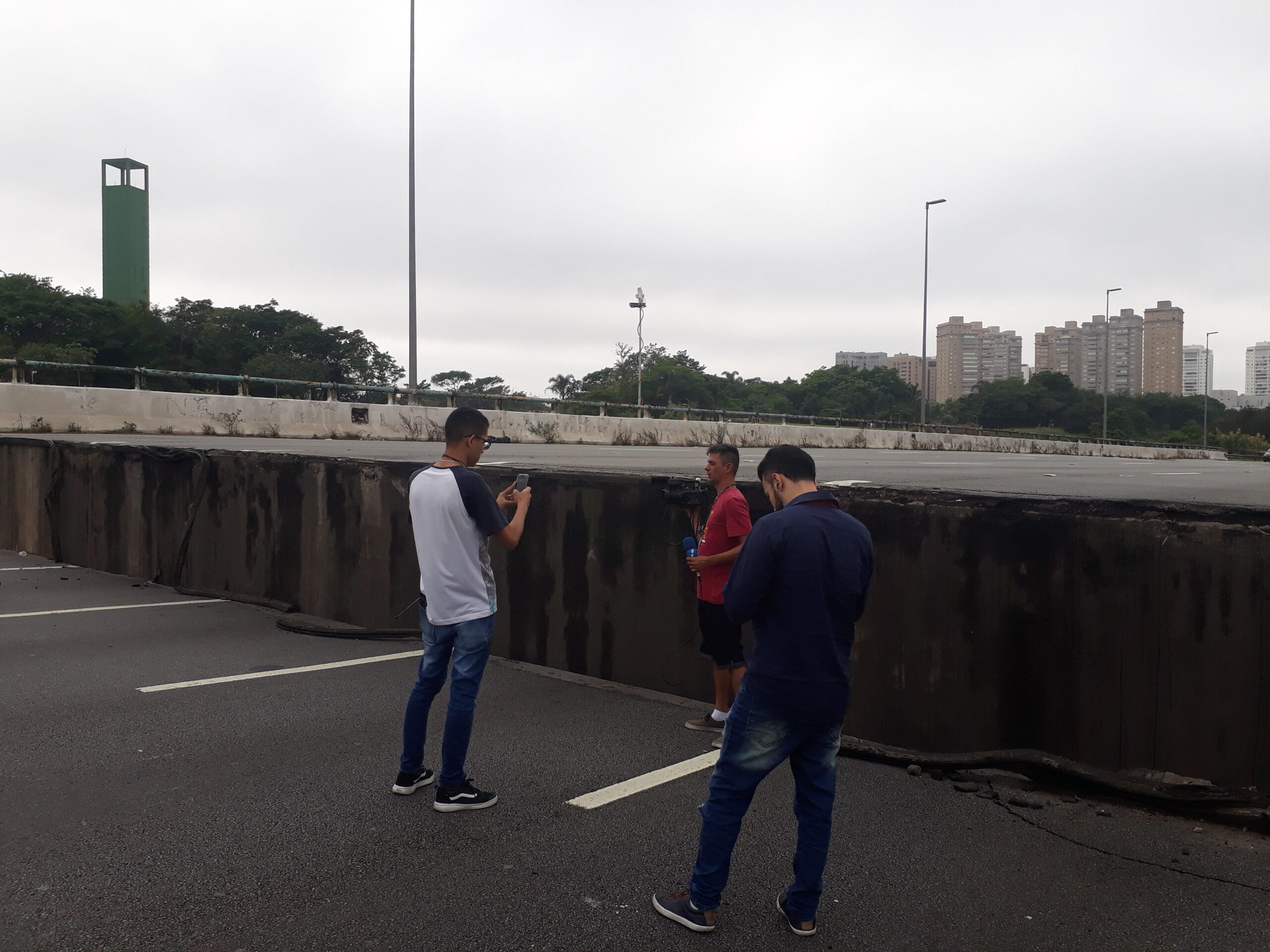 Com o bloqueio do viaduto, a pista expressa está interditada logo após a Ponte da Cidade Universitária. O trânsito está sendo desviado para as três faixas da pista local.