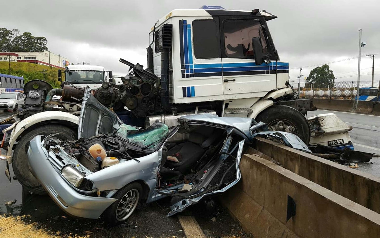 Caminhão perde freio e destrói carro na Dutra, na Grande São Paulo
