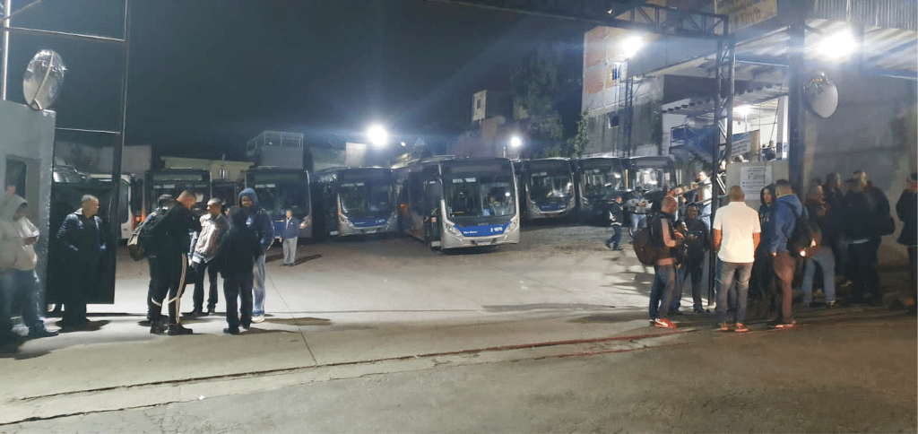 Foto mostra portão de entrada da garagem de ônibus. Ao fundo, ônibus aparecerem estacionados. Nos cantos direitos e esquerdo da imagem há funcionários reunidos antes do sol nascer.