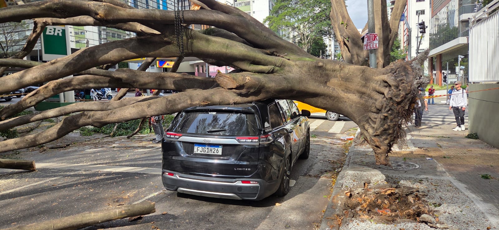 De acordo com as informações iniciais, as vítimas estavam conscientes no momento do resgate. Uma delas apresentava suspeita de fratura na perna. O veículo mais atingido pela queda foi um Jeep Commander, que teve o teto totalmente danificado pelos galhos e troncos da árvore.