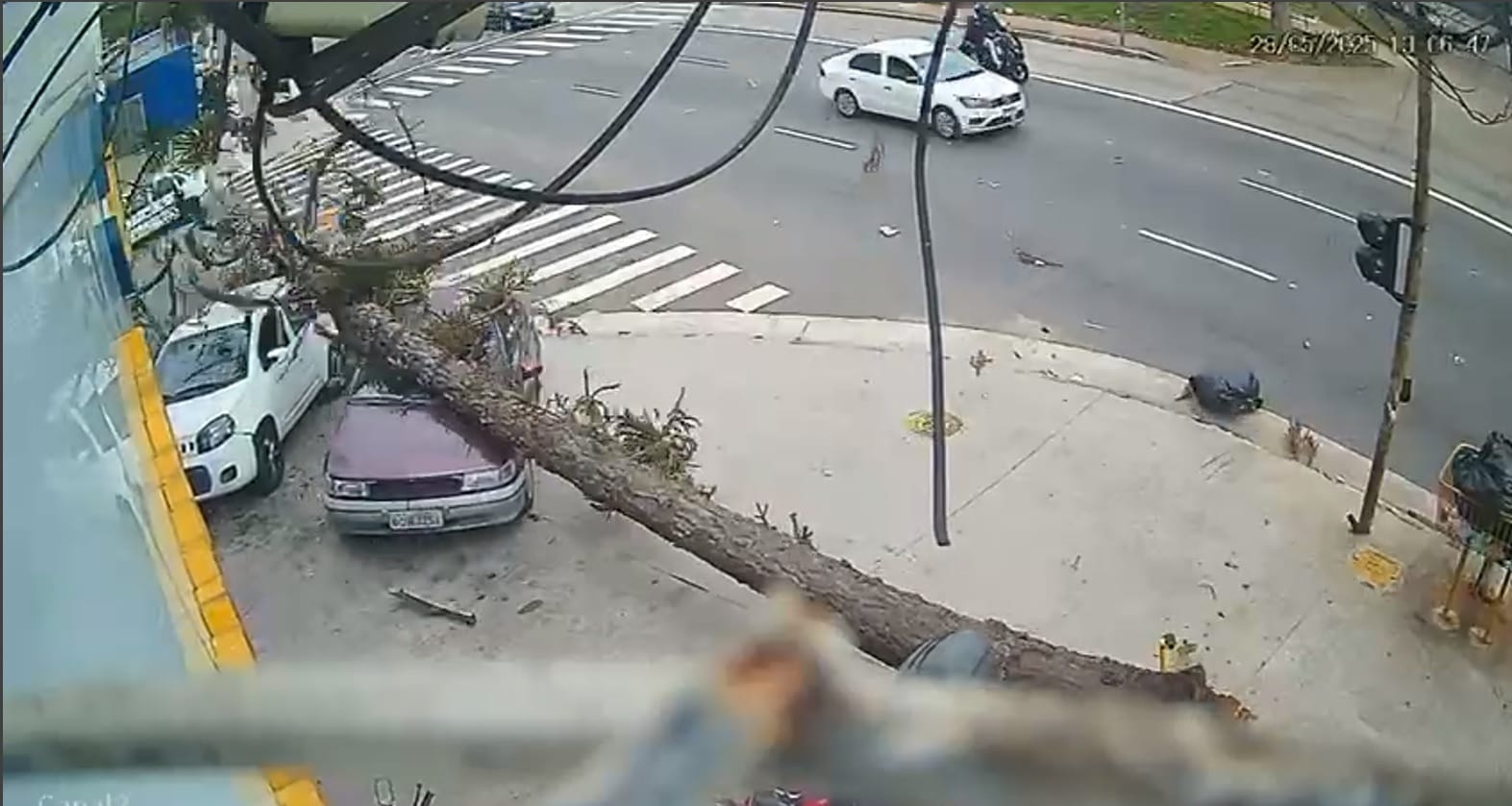Na tarde desta quarta-feira (28), câmeras de segurança flagraram o exato momento em que uma árvore de grande porte desabou sobre dois carros estacionados na Rua Juan de La Cruz, número 181, no bairro do Jabaquara, zona sul de São Paulo (veja no vídeo abaixo).