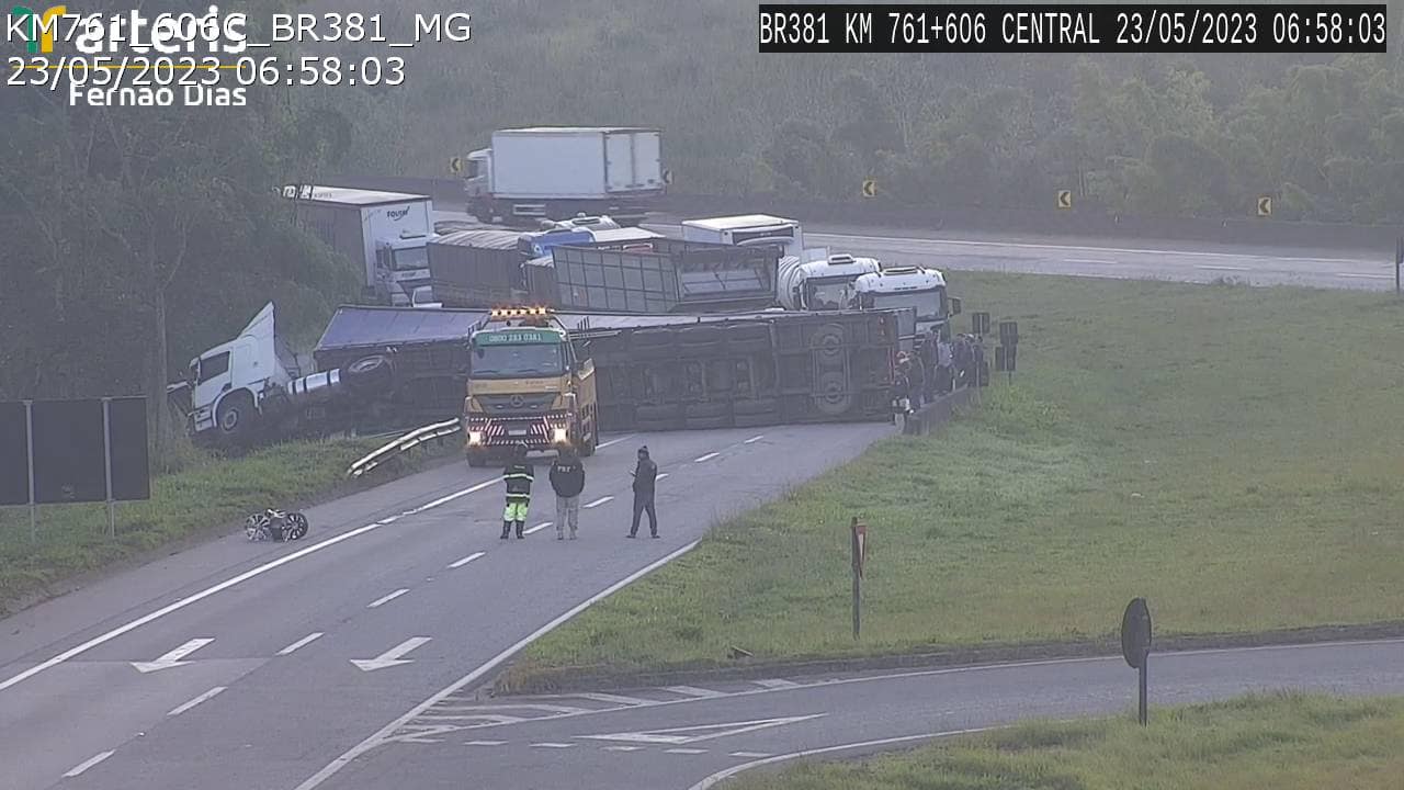 Uma carreta tombou e bloqueou a rodovia Fernão Dias, hoje (23), em Três Corações, interior de Minas Gerais, perto da divisa com o Estado de São Paulo. Após o acidente, a carroceria da carreta ficou atravessada na pista, enquanto que a cabine permaneceu sobre o gramado lateral.