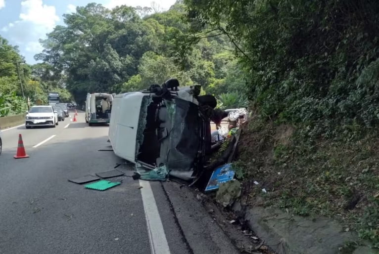O acidente aconteceu por volta das 13h19 deste sábado. A van tombou sozinha e não há envolvimento de outro veículo. Segundo informações da Agência de Transporte do Estado de São Paulo (Artesp), a van perdeu o freio e bateu contra o talude na pista norte da rodovia Anchieta.