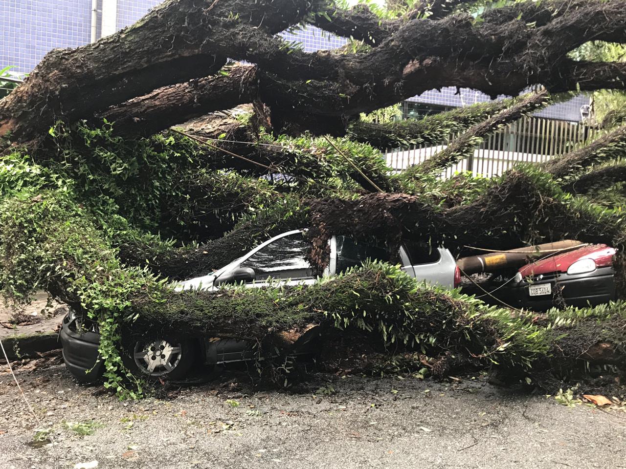 Árvores atingiram veículos e a fiação elétrica.